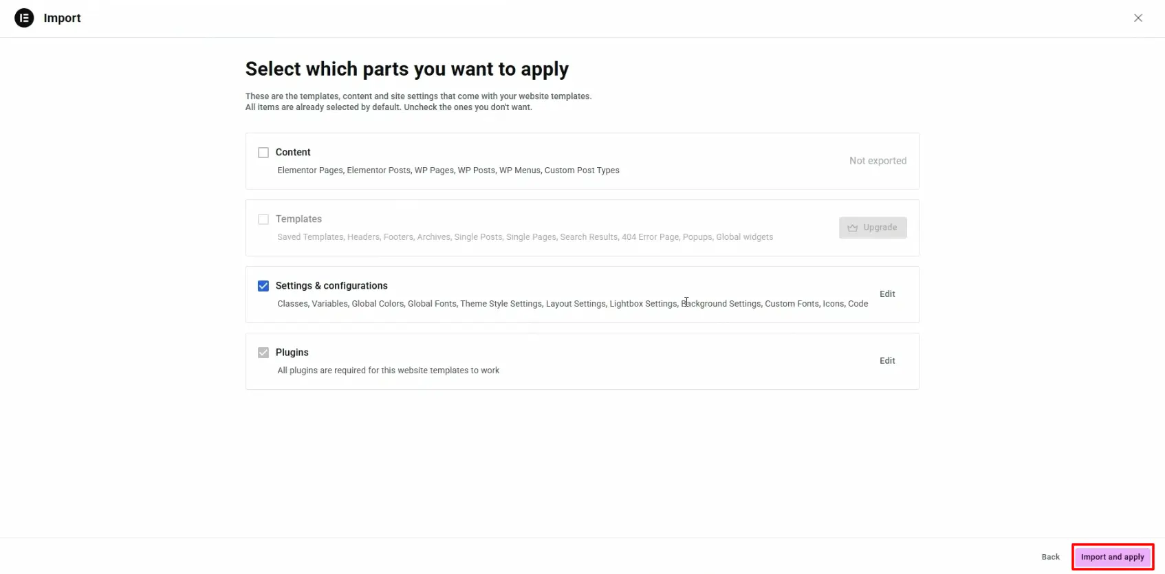 Finally, click on Import to complete the elementor kit import process.