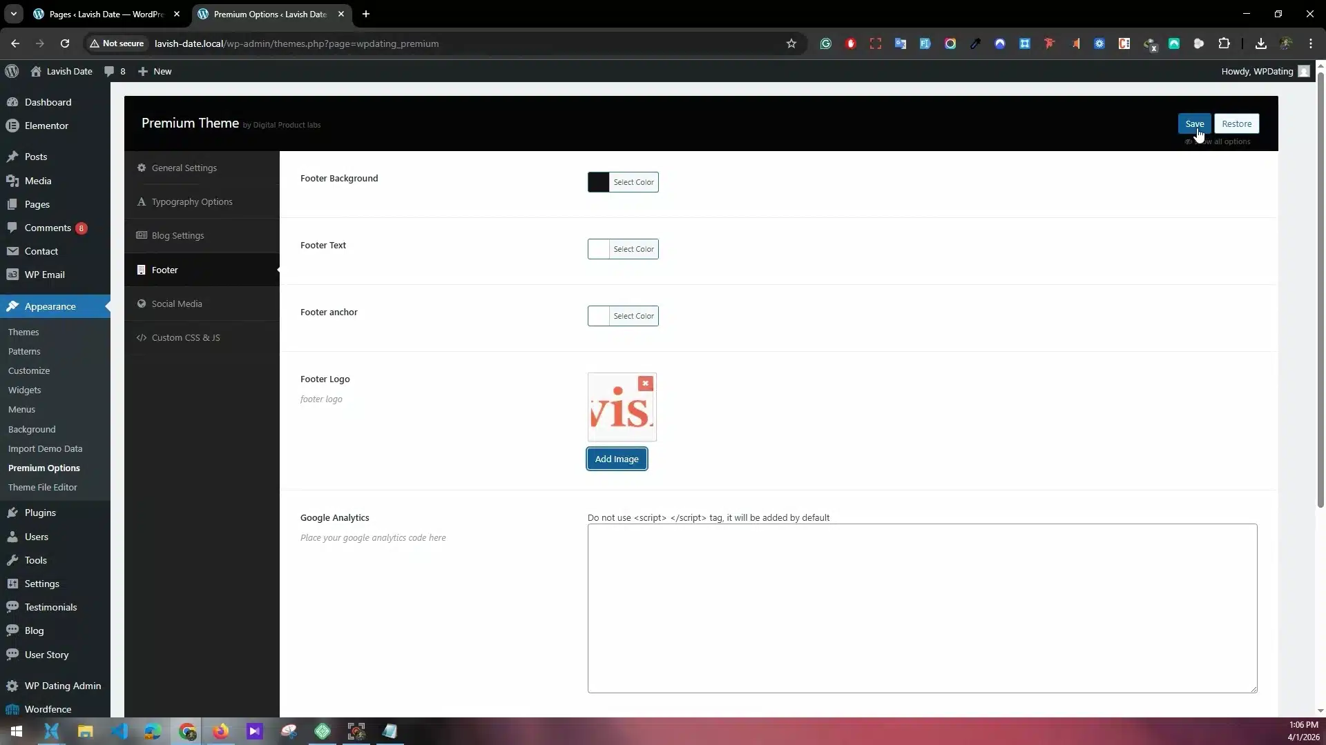 Now, let’s add the Footer logo and Copyright text. After you have finished with the header logo, click Footer in the theme options. Upload your footer logo. Don’t save yet; stay on the footer option and scroll down to enter copyright content.