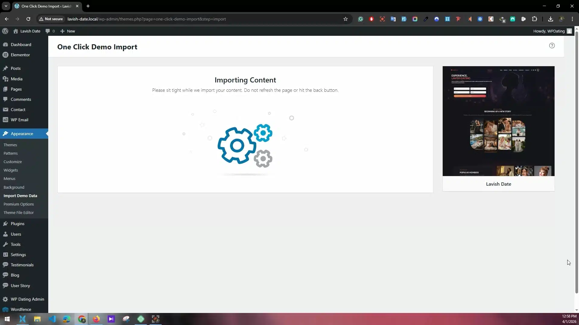 Go to Appearance >> Themes and click on the Lavish Date theme to import the demo data.