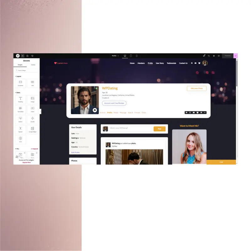 With Lavish Date, you get fully customizable pages powered by Elementor, giving you the freedom to design and update your site effortlessly through a simple drag-and-drop interface.