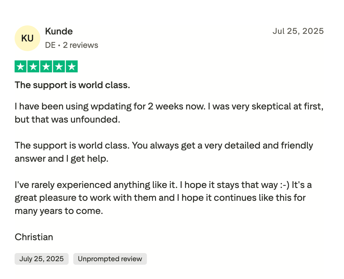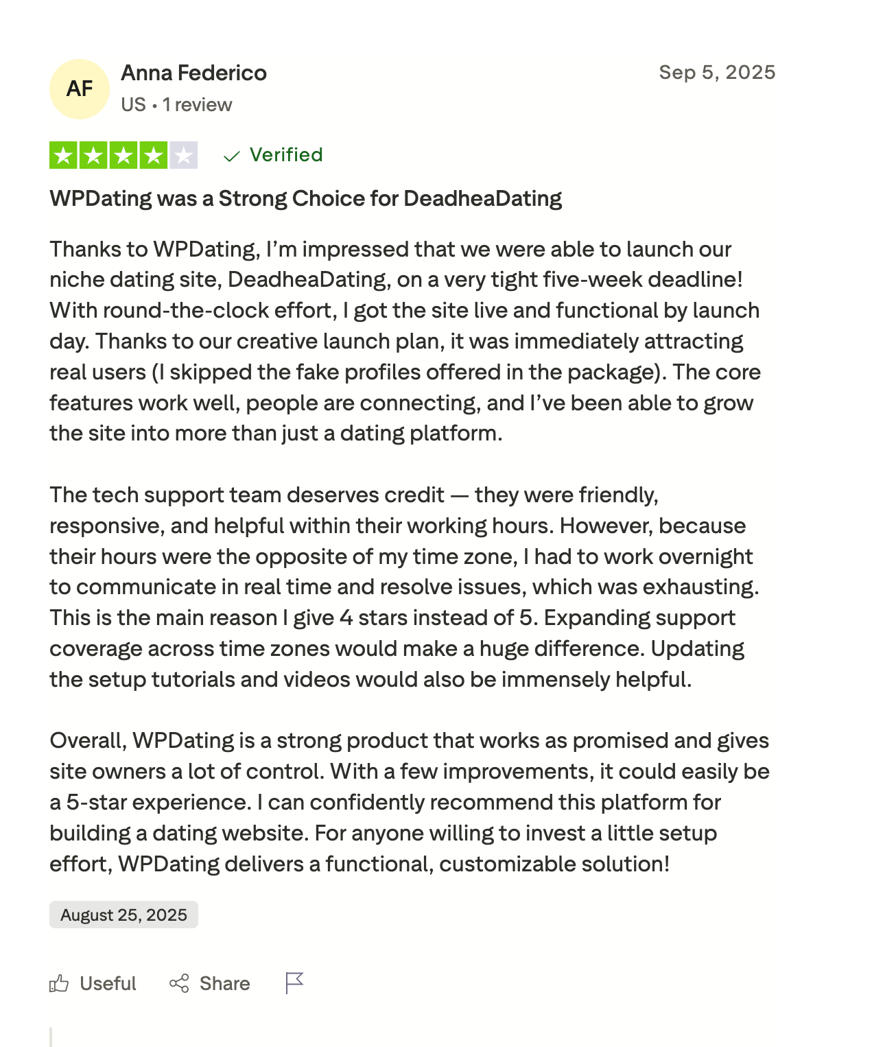 At WP Dating, we’re incredibly grateful for our customers’ valuable feedback and glowing reviews. Their trust and support have been instrumental in helping us expand and enhance our products and services.